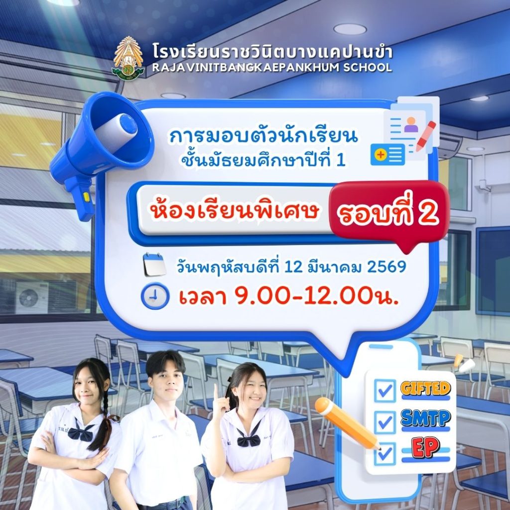 ประกาศรายชื่อนักเรียนผู้ผ่านการสอบคัดเลือก เพื่อเข้าศึกษาต่อระดับชั้นมัธยมศึกษาปีที่ 1 ห้องเรียนพิเศษ ปีการศึกษา 2569 รอบที่ 2